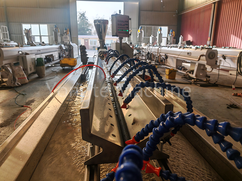 (2) ten 6-metrowy zbiornik do chłodzenia wodą zapewnia szybkie i równomierne chłodzenie w celu ustabilizowania konstrukcji rury i utrzymania dokładności wymiarowej po wytłaczaniu.