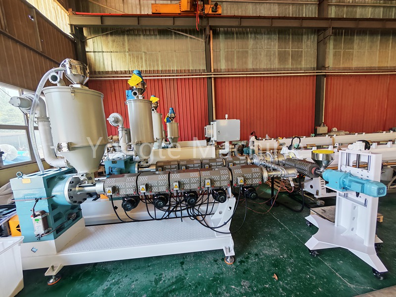 Trzy-warstwowa maszyna do rury PPR zawiera główny wytłaczarka, koekstruderz, wytłaczarkę linii, głowicę matrycową i pleśń, zbiornik chłodzący próżniowy, zbiornik chłodzący wodę, maszynę do pobierania, maszynę do cięcia automatycznego i stosu produktów. Kompletna linia produkcyjna jest przeznaczona do wysokiej automatycznej, wysokiej prędkości produkcji, wysokiej jakości produkcji i łatwej pracy.