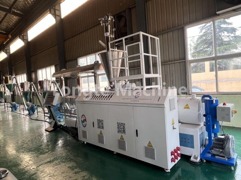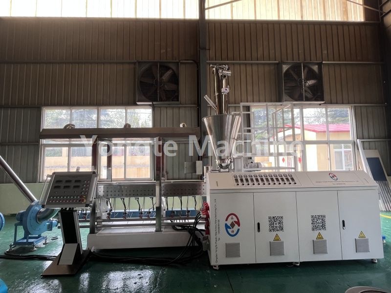 Maszyna do produkcji pelletu Yongte WPC składa się z systemu podawania, równoległego systemu wytłaczania dwuślimakowego, systemu granulowania na gorąco, systemu chłodzenia z nadmuchem i systemu przechowywania materiału.